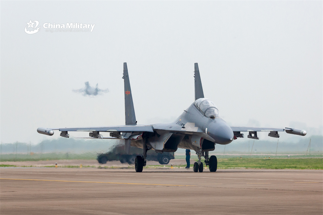 A fighter jet attached to an aviation brigade with the air force under the PLA Eastern Theater Command taxies to the take-off line during a flight training exercise on May 8, 2024. (eng.chinamil.com.cn/Photo by Huang Guotai)
