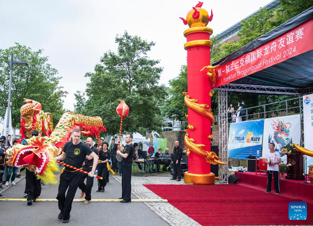People perform dragon dance during the opening ceremony of the 1st Frankfurt Dragonboat Festival in Frankfurt, Germany, May 25, 2024. (Xinhua/Zhang Fan)