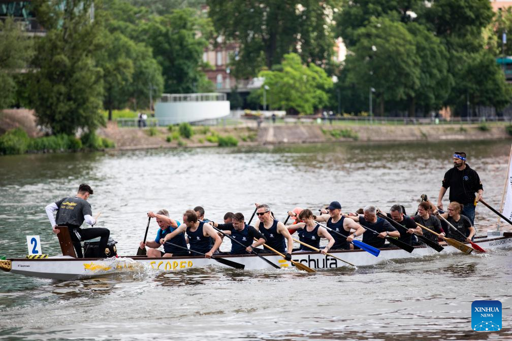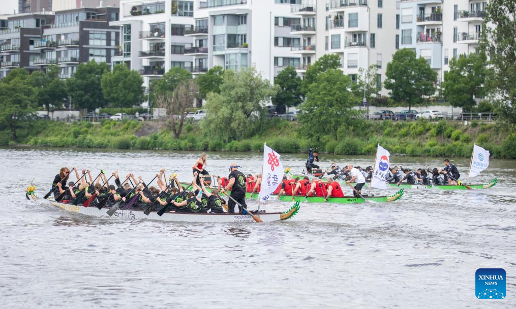 Dragon boats compete on Main River in Frankfurt, Germany, May 25, 2024. (Xinhua/Zhang Fan)