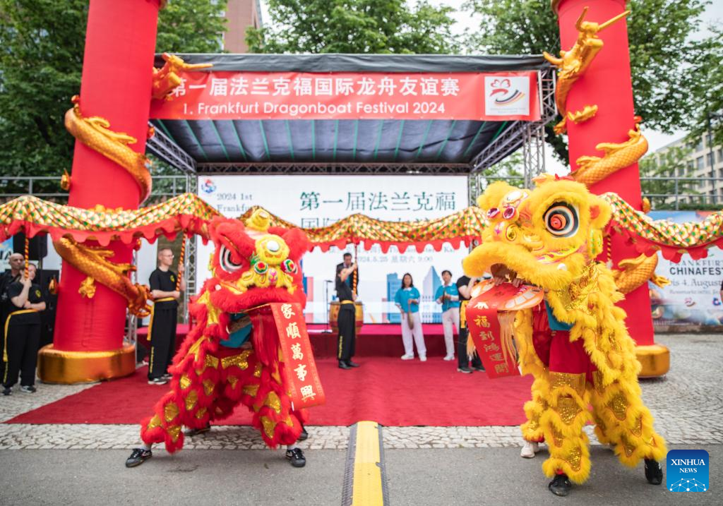 People perform lion dance during the opening ceremony of the 1st Frankfurt Dragonboat Festival in Frankfurt, Germany, May 25, 2024. (Xinhua/Zhang Fan)