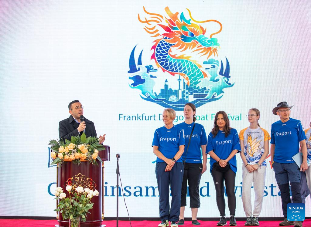 Mike Josef, Lord Mayor of Frankfurt am Main, addresses the opening ceremony of the 1st Frankfurt Dragonboat Festival in Frankfurt, Germany, May 25, 2024. (Xinhua/Zhang Fan)