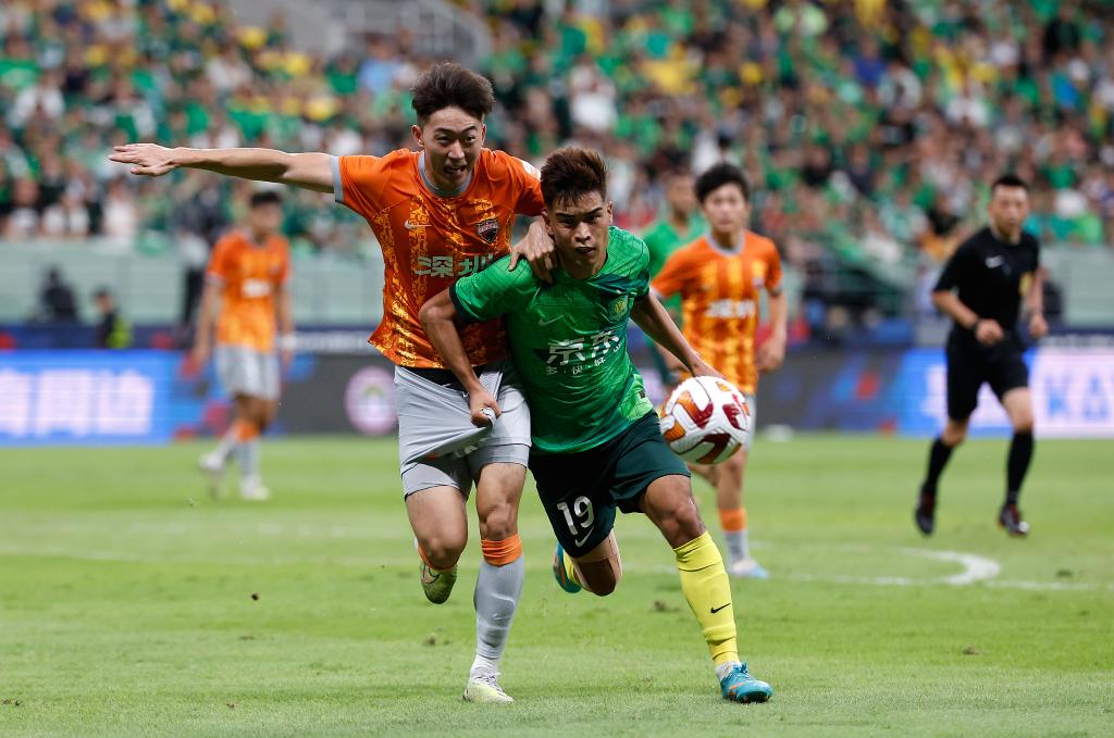 Nebijan Muhmet (R) of Beijing Guoan FC vies with Zhou Xin of Shenzhen FC during a Chinese Football Association Super League (CSL) match between Beijing Guoan FC and Shenzhen FC, in Beijing, capital of China, July 8, 2023. (Xinhua/Wang Lili)