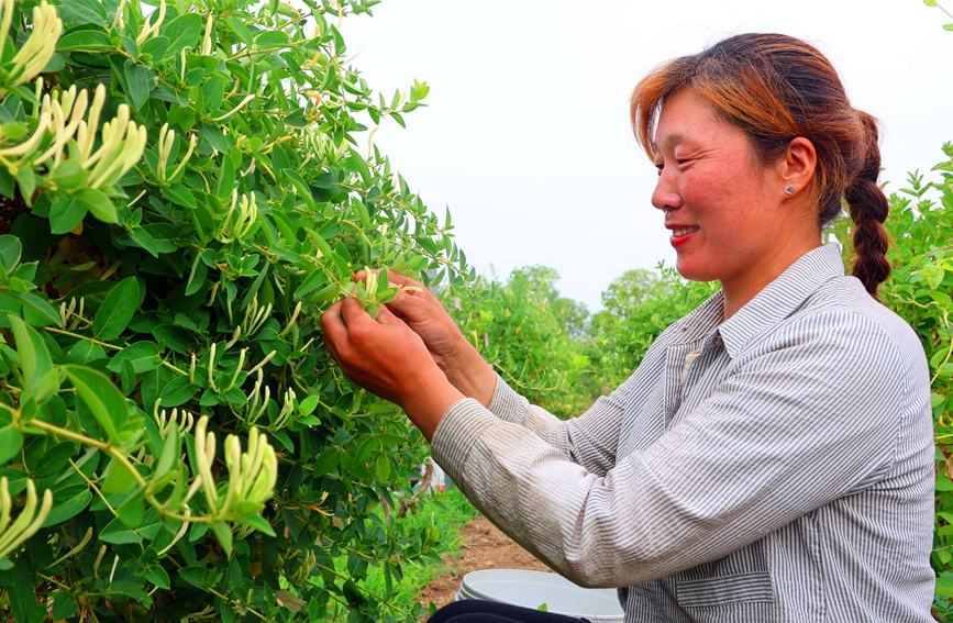 A farmer picks honeysuckle flowers in the honeysuckle base in Shiqiao village in Haozhai township, Sheqi county of Nanyang, central China’s Henan Province. (People’s Daily Online/Xin Jing)