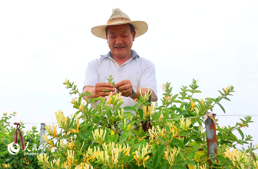 A farmer picks honeysuckle flowers in the honeysuckle base in Shiqiao village in Haozhai township, Sheqi county of Nanyang, central China’s Henan Province. (People’s Daily Online/Xin Jing)