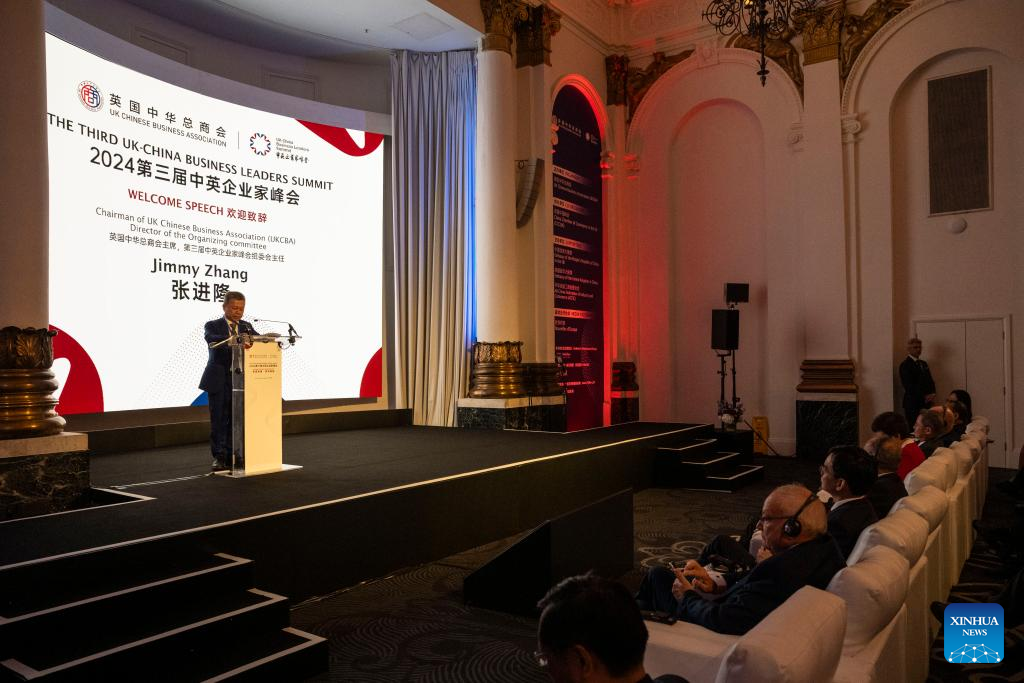 Zhang Jinlong, chairman of the UK Chinese Business Association, speaks at the 3rd United Kingdom (UK)-China Business Leaders Summit in London, Britain, on May 28, 2024. Business leaders and government officials attending the ongoing 3rd United Kingdom (UK)-China Business Leaders Summit here conveyed confidence in the prospect of trade, investment and bilateral ties of the two countries. (Photo by Stephen Chung/Xinhua)