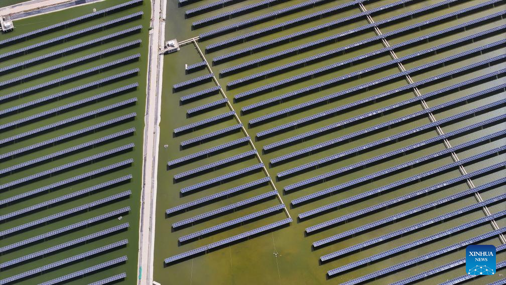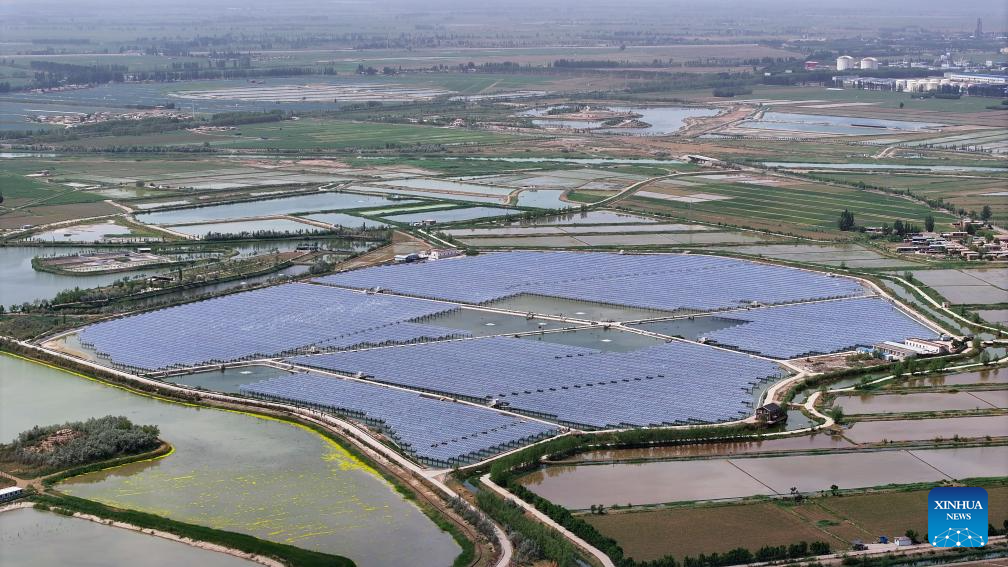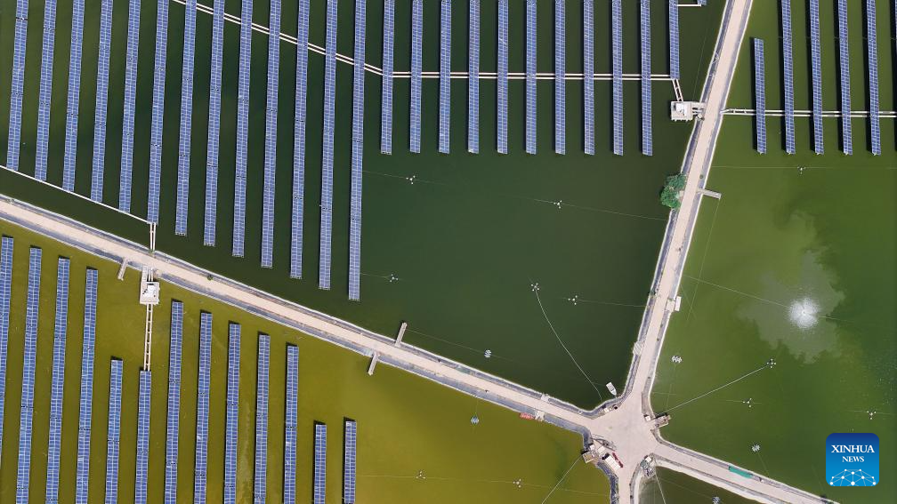 An aerial drone photo taken on May 25, 2024 shows a fishery-solar power integration project in Changxin Township of Helan County, Yinchuan City, northwest China's Ningxia Hui Autonomous Region. Helan County has been popularizing fishery-solar power integration projects as a more efficient and sustainable way to develop its fishery industry. Arrays of photovoltaic modules are set up on fishponds to avail of the generous sunlight while providing shield for the fish therein. These projects have brought extra income to local fishpond operators. (Xinhua/Wang Peng)