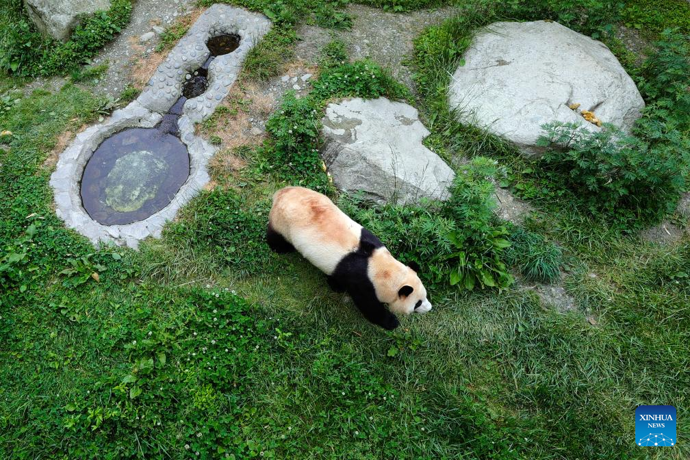 Giant panda Fu Bao wanders at the Shenshuping giant panda base in Wolong National Nature Reserve in southwest China's Sichuan Province, May 27, 2024. (Xinhua/Shen Bohan)