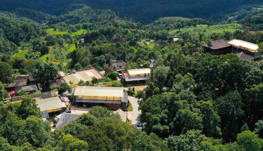 An aerial drone photo taken on Aug. 30, 2023 shows shacks built for tea drying at Mangjing Village in Pu'er City, southwest China's Yunnan Province. (Xinhua/Li He)