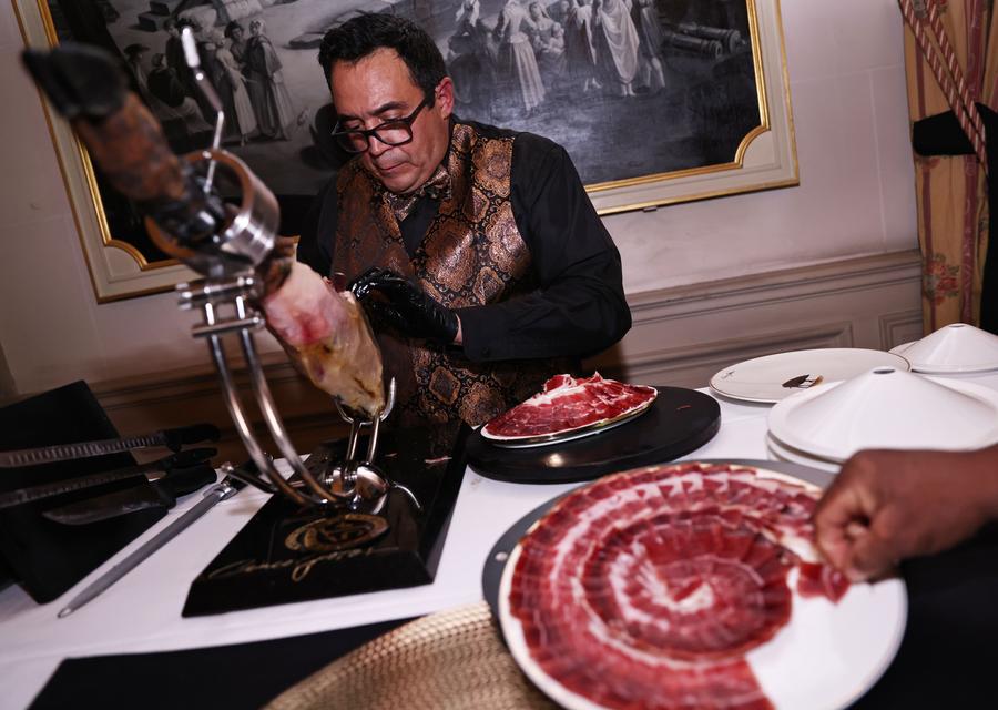 A chef prepares 5J Cinco Jotas iberico ham at the unveiling ceremony of LA LISTE 2024 world restaurant ranking at the French Ministry of Foreign Affairs in Paris, France, Nov. 20, 2023. (Xinhua/Gao Jing)