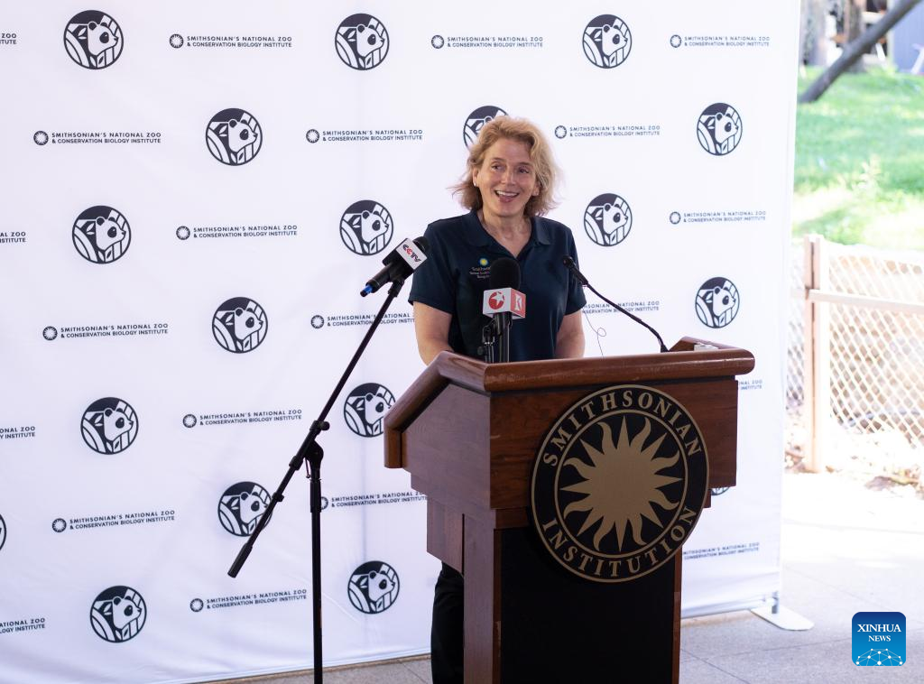 Brandie Smith, John and Adrienne Mars Director of the Smithsonian's National Zoo and Conservation Biology Institute, speaks during a press conference at Smithsonian's National Zoo in Washington, D.C., the United States, on May 29, 2024. The National Zoo in Washington, D.C., announced Wednesday it will receive two giant panda cubs, one male and one female, from China by the end of the year. (Xinhua/Liu Jie)