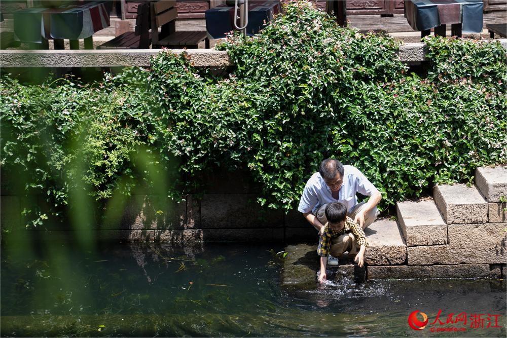 An older man plays with a child by the Yuehe River in Jiaxing, east China's Zhejiang Province, May 26, 2024. (People's Daily Online/Chen Luxun)