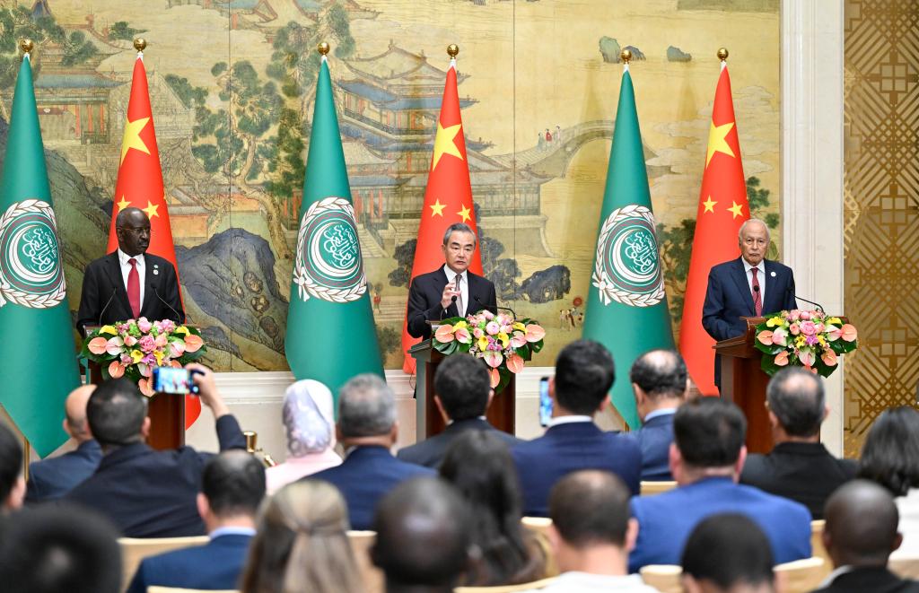 Chinese Foreign Minister Wang Yi, also a member of the Political Bureau of the Communist Party of China Central Committee, Mohamed Salem Ould Merzouk, Mauritania's minister of foreign affairs, cooperation and Mauritanians abroad, and Ahmed Aboul-Gheit, Secretary-General of the League of Arab States, meet the press after the 10th ministerial meeting of the China-Arab States Cooperation Forum, in Beijing, capital of China, May 30, 2024. (Xinhua/Yin Bogu)