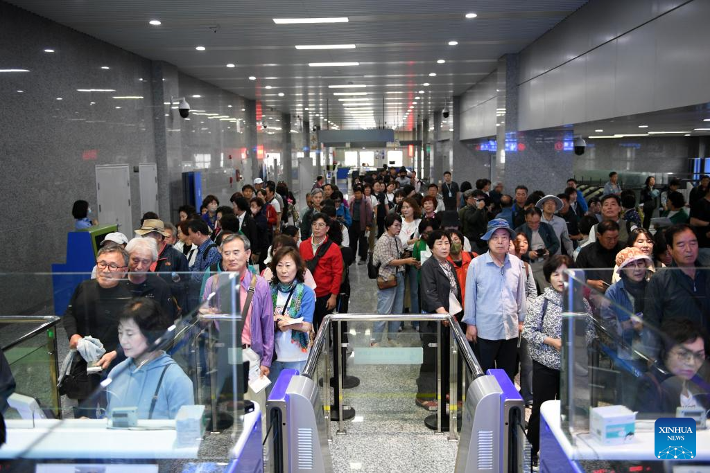 South Korean tourists line up to pass through passenger clearance procedures at Zhangjiajie Hehua International Airport in Zhangjiajie, central China's Hunan Province, May 27, 2024. In the first quarter of 2024, Zhangjiajie saw 105,100 South Korean tourist trips, a 27.07 percent increase compared to the same period in 2019, and is accounted for 40.23 percent of the total number of inbound tourists to Zhangjiajie. Currently, there are direct flights from five cities in South Korea to Zhangjiajie, including Seoul and Busan, with a total of 52 flights per week. (Xinhua/Chen Zhenhai)