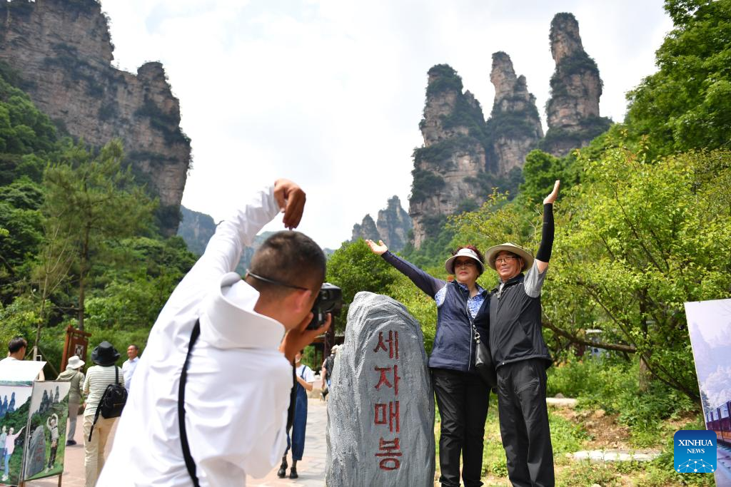 South Korean tourists pose for photos at the Zhangjiajie National Forest Park in Zhangjiajie, central China's Hunan Province, May 22, 2024. In the first quarter of 2024, Zhangjiajie saw 105,100 South Korean tourist trips, a 27.07 percent increase compared to the same period in 2019, and is accounted for 40.23 percent of the total number of inbound tourists to Zhangjiajie. Currently, there are direct flights from five cities in South Korea to Zhangjiajie, including Seoul and Busan, with a total of 52 flights per week. (Xinhua/Chen Zhenhai)