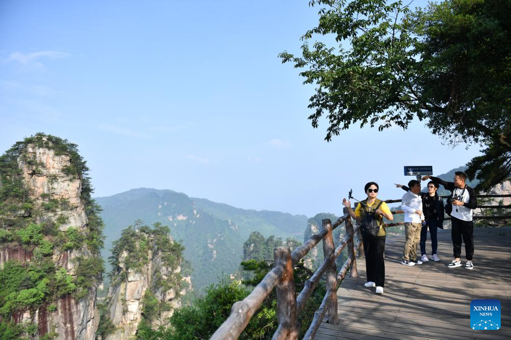 South Korean tourists visit the Baofeng Lake of Wulingyuan District in Zhangjiajie, central China's Hunan Province, May 24, 2024. In the first quarter of 2024, Zhangjiajie saw 105,100 South Korean tourist trips, a 27.07 percent increase compared to the same period in 2019, and is accounted for 40.23 percent of the total number of inbound tourists to Zhangjiajie. Currently, there are direct flights from five cities in South Korea to Zhangjiajie, including Seoul and Busan, with a total of 52 flights per week. (Xinhua/Chen Zhenhai)