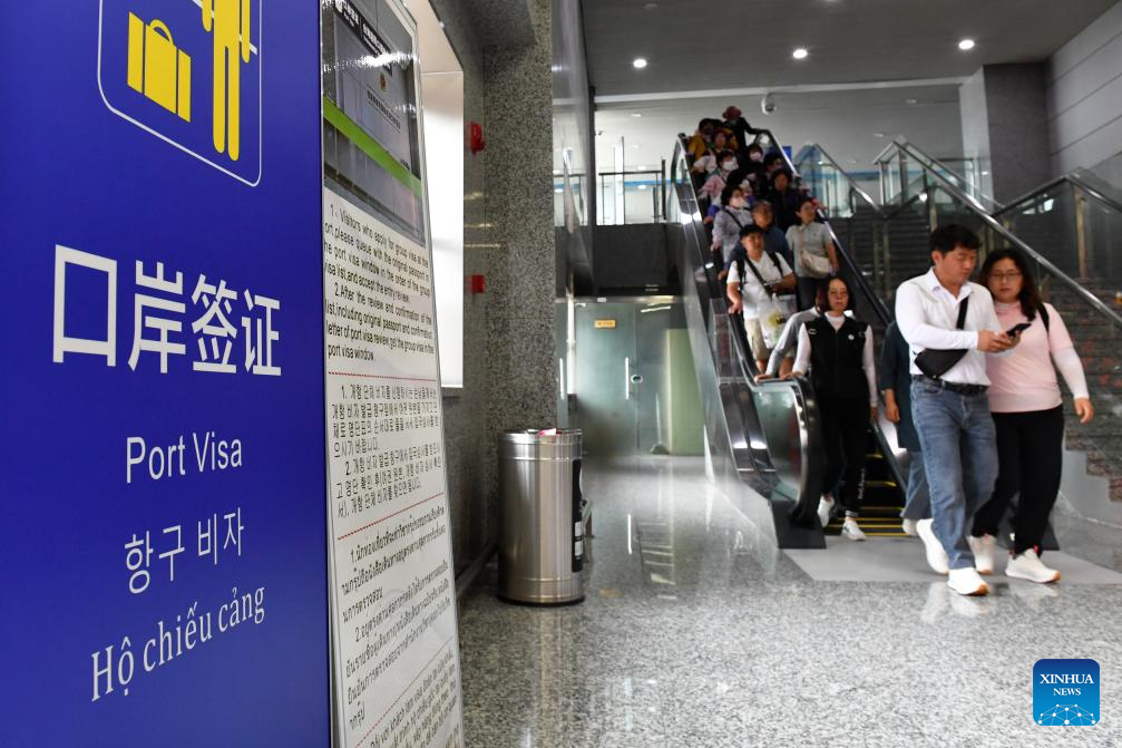 South Korean tourists arrive at Zhangjiajie Hehua International Airport in Zhangjiajie, central China's Hunan Province, May 27, 2024. In the first quarter of 2024, Zhangjiajie saw 105,100 South Korean tourist trips, a 27.07 percent increase compared to the same period in 2019, and is accounted for 40.23 percent of the total number of inbound tourists to Zhangjiajie. Currently, there are direct flights from five cities in South Korea to Zhangjiajie, including Seoul and Busan, with a total of 52 flights per week. (Xinhua/Chen Zhenhai)