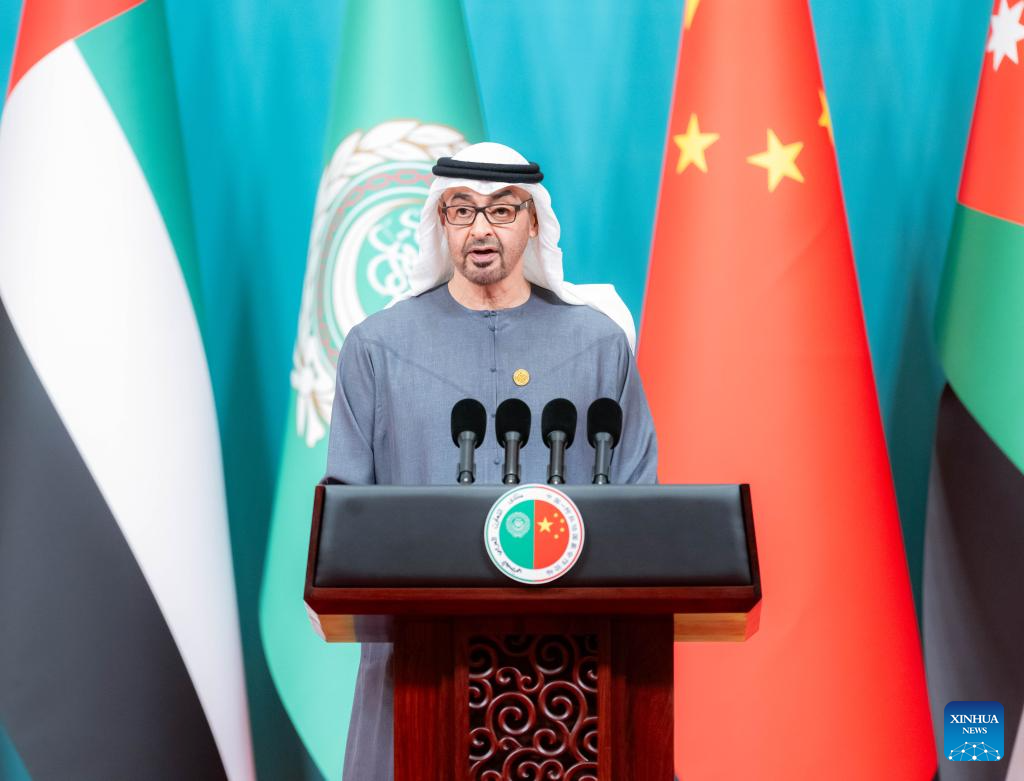 The United Arab Emirates' President Sheikh Mohamed bin Zayed Al Nahyan speaks during the opening ceremony of the 10th ministerial conference of the China-Arab States Cooperation Forum in Beijing, capital of China, May 30, 2024. (Xinhua/Zhai Jianlan)