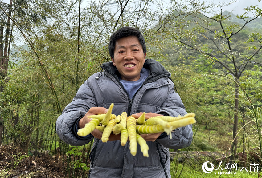Luo Kunheng smiles while holding freshly harvested bamboo shoots. (People's Daily Online/Fu Hao)
