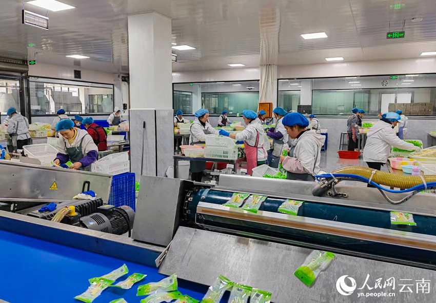 Workers process bamboo shoot products at a food company in Daguan county, Zhaotong city, southwest China's Yunnan Province. (People's Daily Online/Fu Hao)