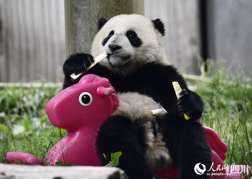 The cub of giant panda "Sulin" eats a bamboo shoot while playing at the Shenshuping base of the China Conservation and Research Center for Giant Panda in Wolong, southwest China's Sichuan Province. (People's Daily Online/Wang Bo)