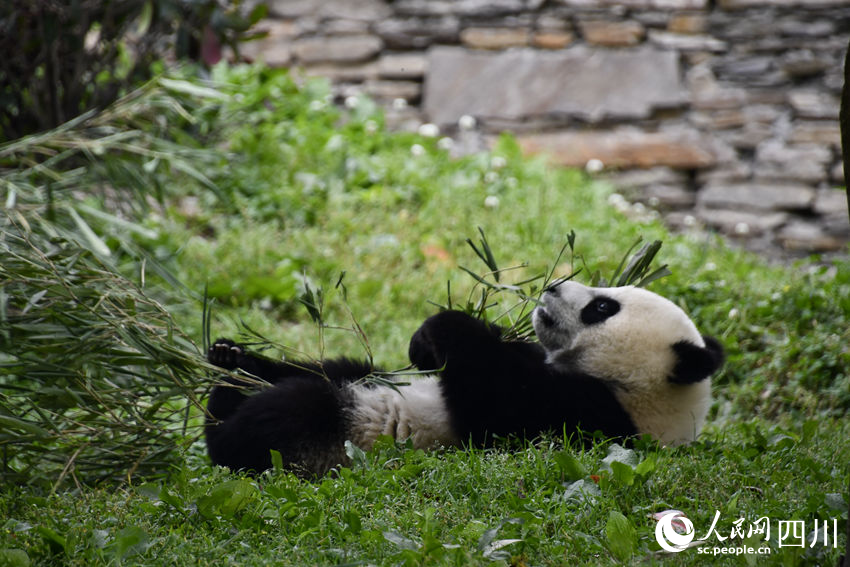 Photo shows giant panda "Fu Bao," which is less than four years old and has just returned home from South Korea, at the Shenshuping base of the China Conservation and Research Center for Giant Panda in Wolong, southwest China's Sichuan Province. (People's Daily Online/Wang Bo)