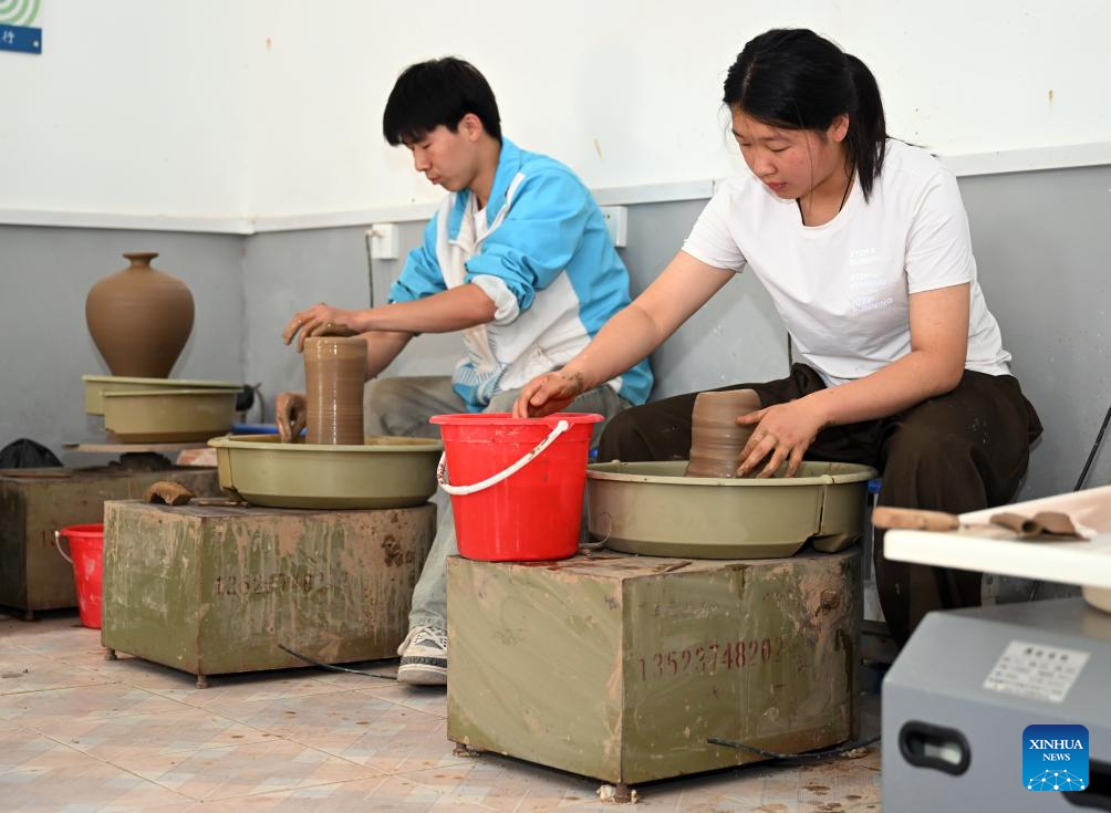 Students learn about Jieshou painted pottery making at Fuyang Science and Engineering School in Jieshou City of east China's Anhui Province, May 24, 2024. (Xinhua/Zhou Mu)