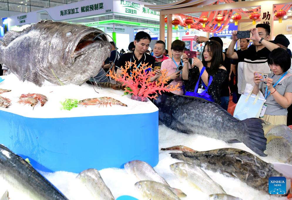 People visit the 2024 China (Fuzhou) International Seafood &Fisheries Expo in Fuzhou, capital of southeast China's Fujian Province, May 31, 2024. The 2024 China (Fuzhou) International Seafood &Fisheries Expo kicked off at Fuzhou Strait International Conference &Exhibition Center in Fuzhou Friday, attracting nearly 500 companies from more than 30 countries and regions. The expo involves aquaculture, ocean fishing, aquatic processing and other fishery industry sectors. (Xinhua/Wei Peiquan)