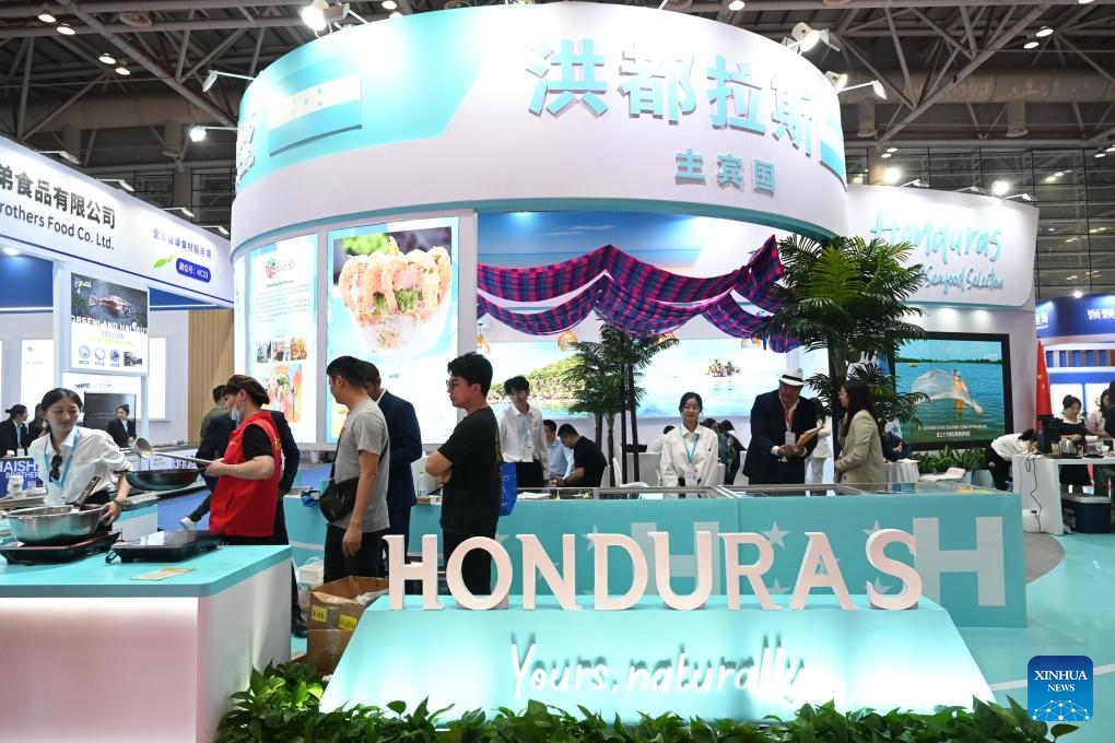 People visit the booth of Honduras, guest of honor of the 2024 China (Fuzhou) International Seafood &Fisheries Expo, in Fuzhou, capital of southeast China's Fujian Province, May 31, 2024. The 2024 China (Fuzhou) International Seafood &Fisheries Expo kicked off at Fuzhou Strait International Conference &Exhibition Center in Fuzhou Friday, attracting nearly 500 companies from more than 30 countries and regions. The expo involves aquaculture, ocean fishing, aquatic processing and other fishery industry sectors. (Xinhua/Lin Shanchuan)