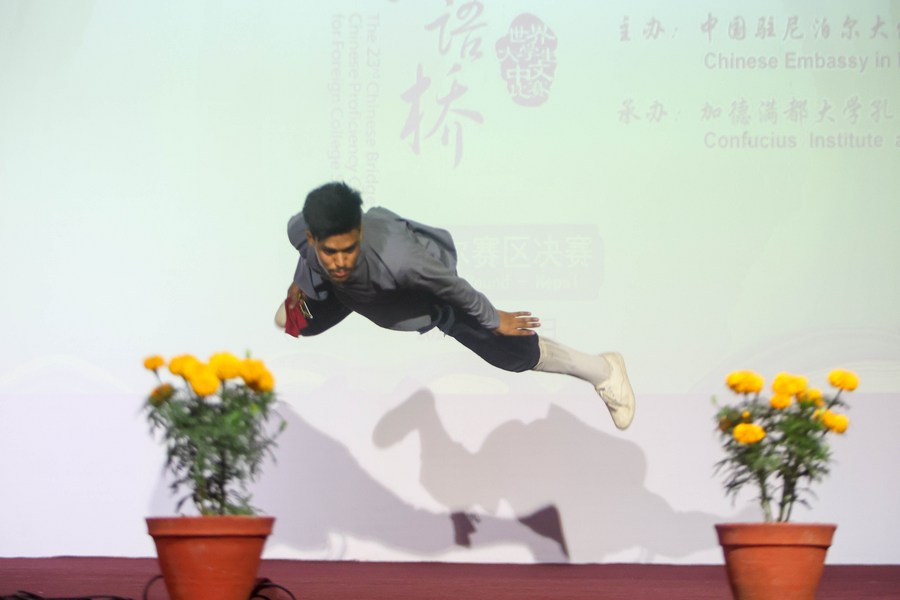Contestants at the final for the 23rd Chinese-Bridge Chinese proficiency competition for foreign college students in Nepal demonstrate their Chinese language skills and understanding of Chinese culture through speech, knowledge test and talent show.