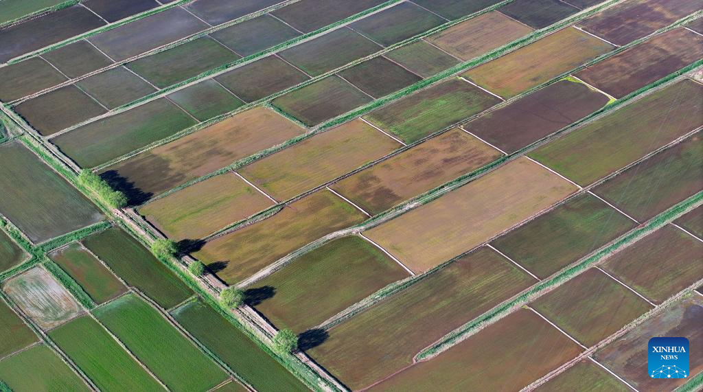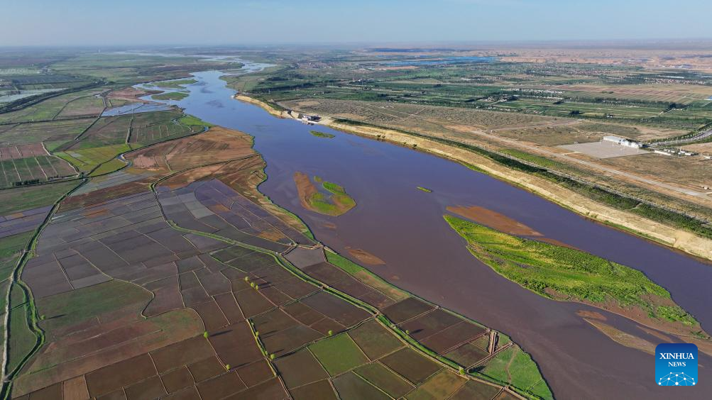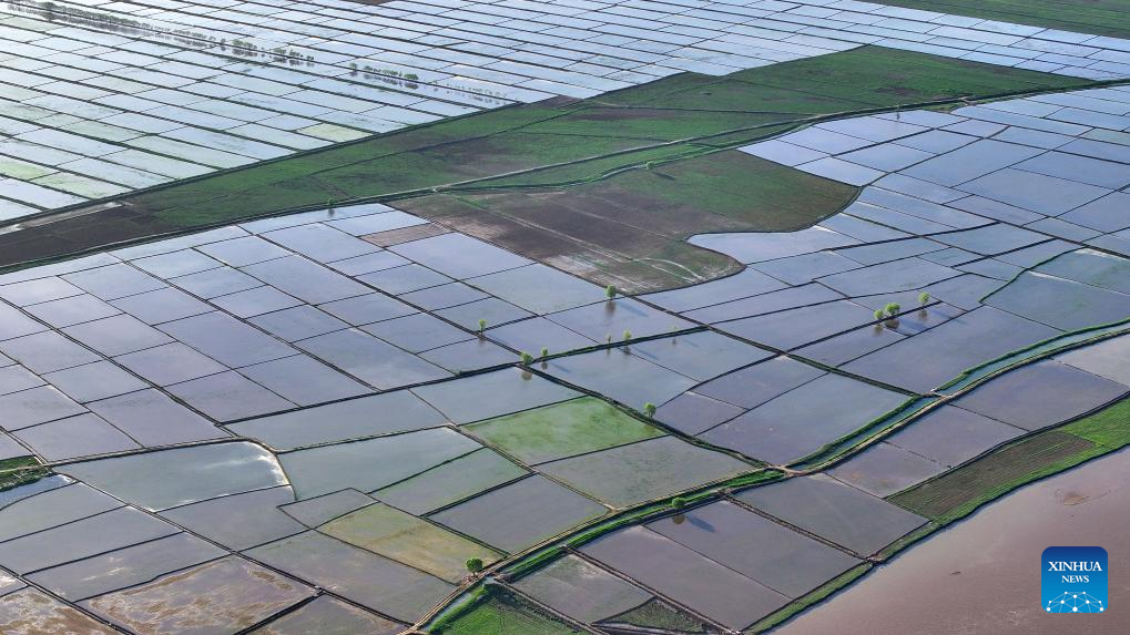 An aerial drone photo taken on May 30, 2024 shows the paddy fields along the Yellow River in Yinchuan, northwest China's Ningxia Hui Autonomous Region. This rice planting season has drawn to an end. Abundant supply of water and sunshine in June injects extra vigor into these newly planted seedlings. (Xinhua/Wang Peng)