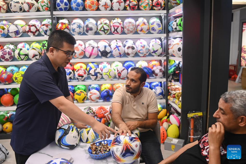 A businessman introduces football products to customers from Egypt in Yiwu, east China's Zhejiang Province, May 30, 2024. Yiwu, a world-famous small commodities manufacturing hub, is buzzing with production orders with the approach of the Paris 2024 Olympic Games. (Xinhua/Huang Zongzhi)