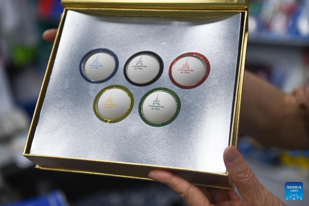 A businessman shows a souvenir table tennis ball set made for the Paris 2024 Olympic Games in Yiwu, east China's Zhejiang Province, May 30, 2024. Yiwu, a world-famous small commodities manufacturing hub, is buzzing with production orders with the approach of the Paris 2024 Olympic Games. (Xinhua/Huang Zongzhi)