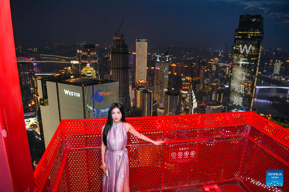 A tourist poses for photos with the night view of Chongqing Municipality, southwest China, May 30, 2024. (Xinhua/Wang Quanchao)