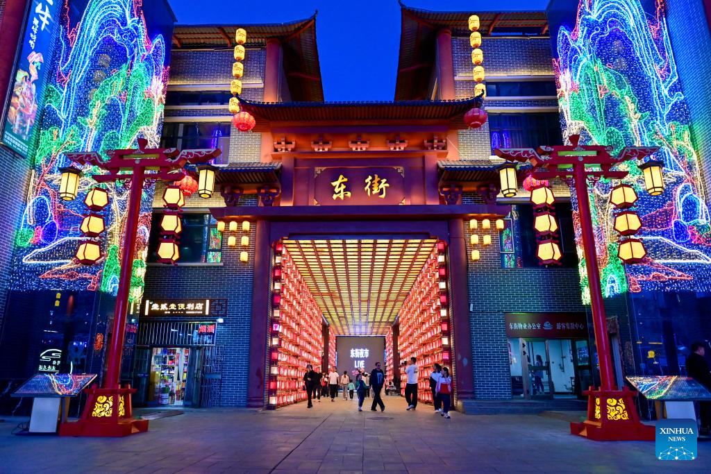 People visit a night market in Emin County, Tacheng Prefecture, northwest China's Xinjiang Uygur Autonomous Region, May 29, 2024, Xinjiang in northwest China has entered its peak tourism season recently. Emin County, located near the China-Kazakhstan border, is a popular tourist destination which provides various rural tour routes and cultural events. (Xinhua/Ding Lei)