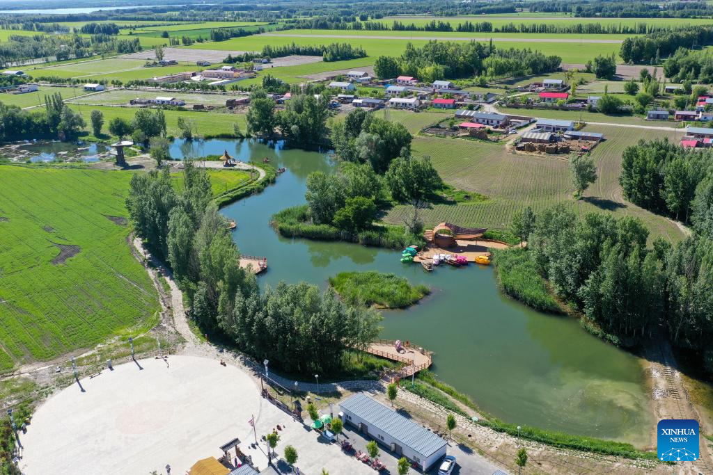 An aerial drone photo taken on May 30, 2024 shows an agro-tourism area in Emin County, Tacheng Prefecture, northwest China's Xinjiang Uygur Autonomous Region. Xinjiang in northwest China has entered its peak tourism season recently. Emin County, located near the China-Kazakhstan border, is a popular tourist destination which provides various rural tour routes and cultural events. (Xinhua/Ding Lei)