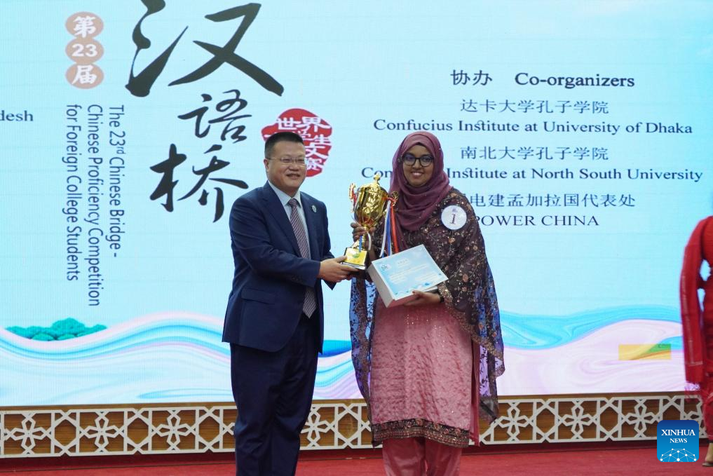 Yao Wen, Chinese ambassador to Bangladesh, presents an award to a contestant during the 23rd Chinese Bridge - Chinese proficiency competition for foreign college students in Dhaka, Bangladesh on May 31, 2024. (Xinhua/Sun Nan)