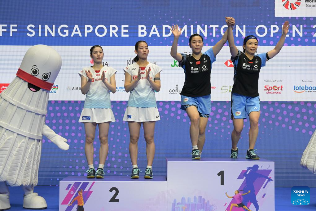 Chen Qingchen (R)/Jia Yifan of China attend the awarding ceremony for the women's doubles at the Singapore Badminton Open 2024 in Singapore, June 2, 2024. (Photo by Then Chih Wey/Xinhua)