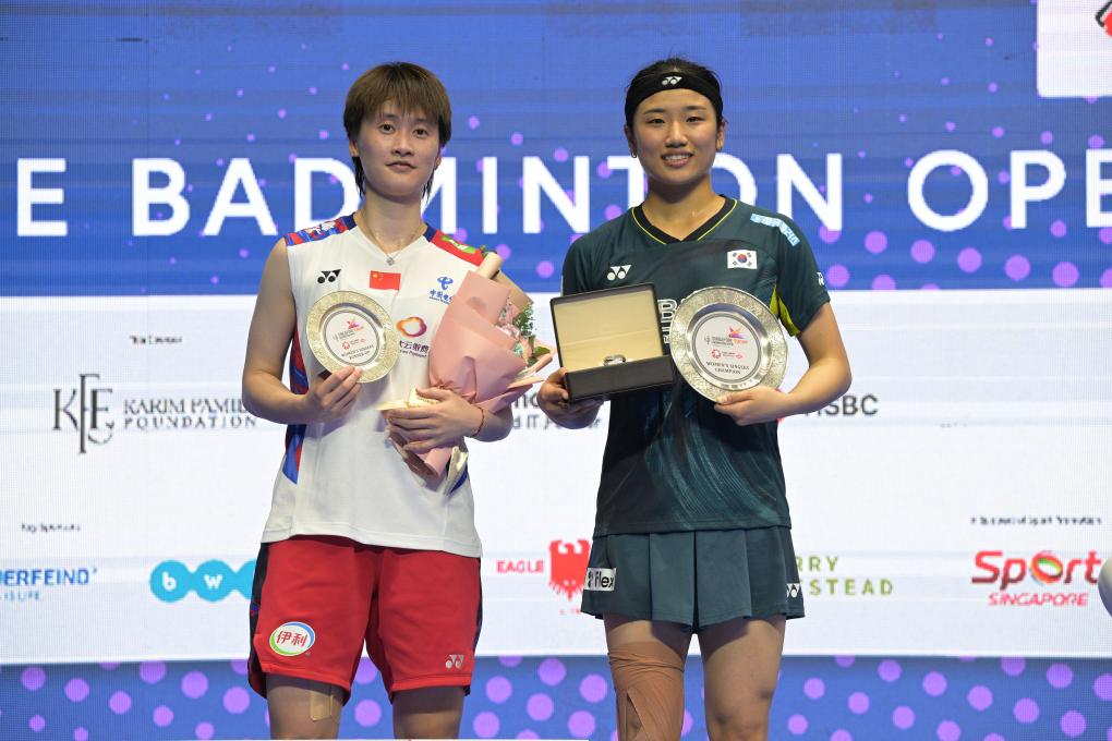 Champion An Se Young (R) and runner-up Chen Yufei pose on the podium after the women's singles final between An Se Young of South Korea and Chen Yufei of China at the Singapore Badminton Open 2024 in Singapore, June 2, 2024. (Photo by Then Chih Wey/Xinhua)