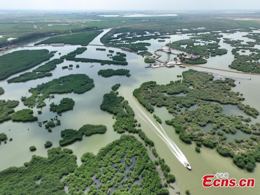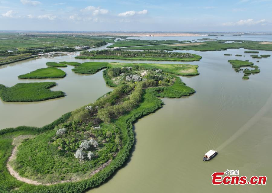 A sightseeing boat cruises at the Shahu Lake scenic spot in Shizuishan, Northwest China's Ningxia Hui Autonomous Region, June 2, 2024. (Photo: China News Service/Yu Jing)