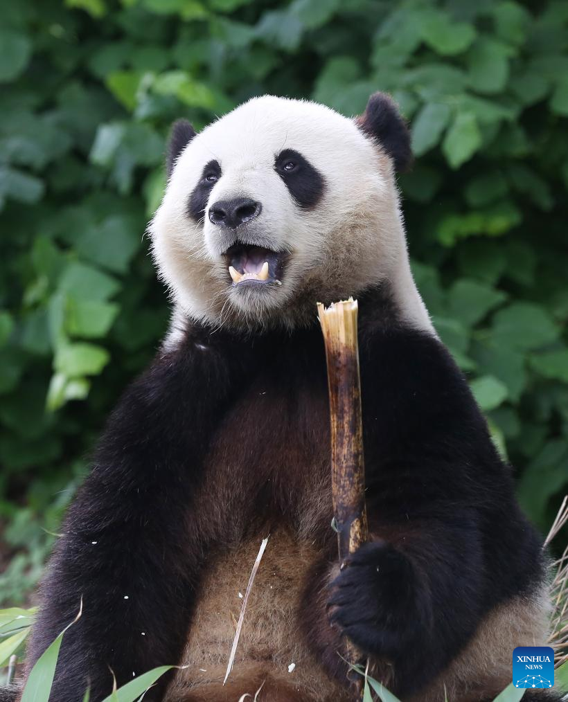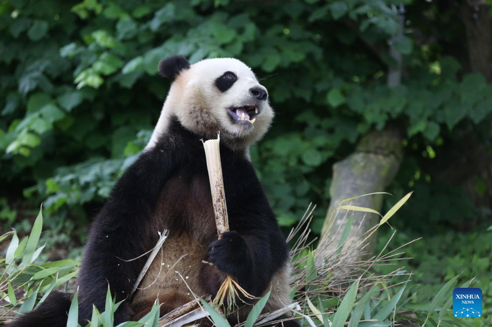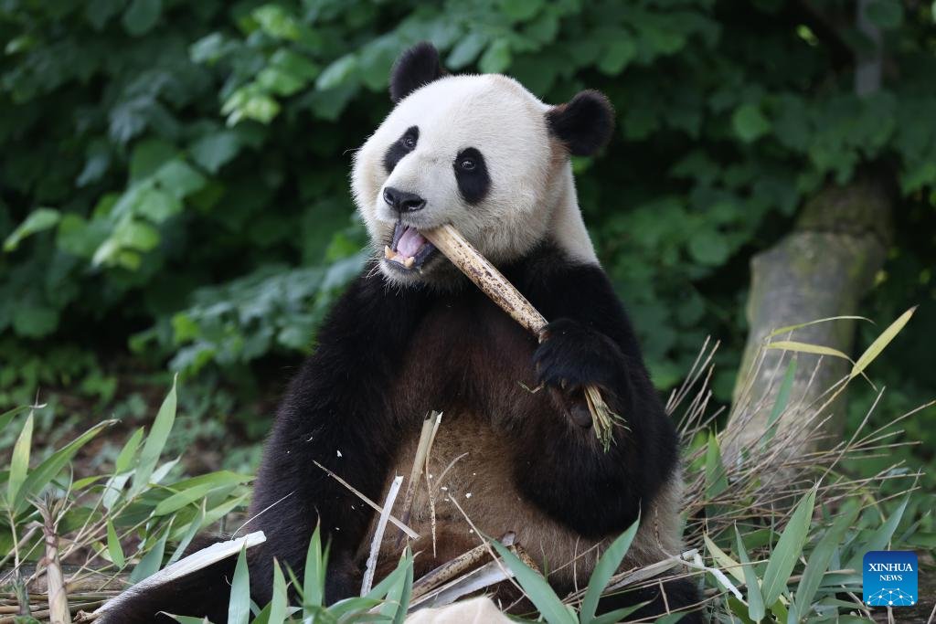 Giant panda Tian Bao enjoys a birthday meal at the Pairi Daiza Zoo in Brugelette, Belgium, June 2, 2024. The Belgian Pairi Daiza Zoo celebrated the 8th birthday of giant panda Tian Bao on Sunday. (Xinhua/Zhao Dingzhe)