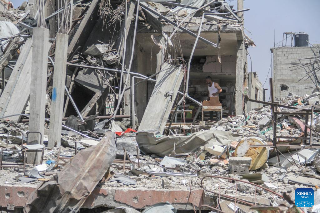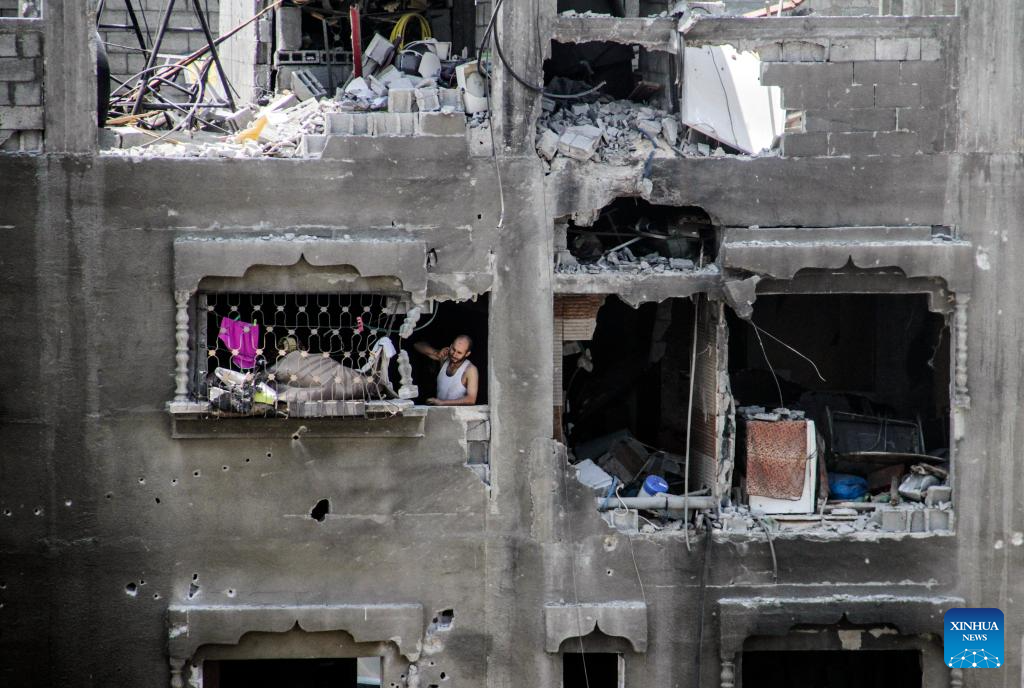 A man is seen in a destroyed building at the Jabalia camp in the northern Gaza Strip, on June 3, 2024. Days after the Israeli army withdrew from Jabalia camp in the northern Gaza Strip after nearly three weeks of military operation, Mohammed Omran, who returned to the camp, is still in shock due to the scale and intensity of destruction in his neighborhood. During the offensive, at least 50,000 housing units were destroyed. Meanwhile, most of the sewage networks and roads in northern Gaza were completely damaged, according to Naji Sarhan, head of the municipal emergency committee in northern Gaza. (Photo by Mahmoud Zaki/Xinhua)