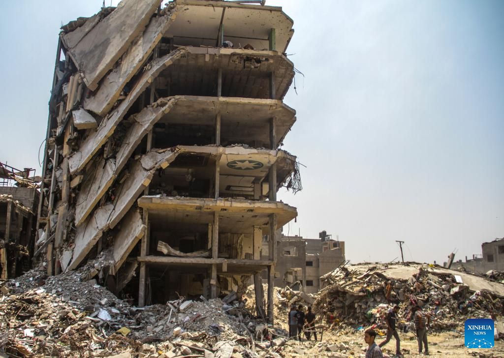 People are seen in front of destroyed buildings at the Jabalia camp in the northern Gaza Strip, on June 3, 2024. Days after the Israeli army withdrew from Jabalia camp in the northern Gaza Strip after nearly three weeks of military operation, Mohammed Omran, who returned to the camp, is still in shock due to the scale and intensity of destruction in his neighborhood. During the offensive, at least 50,000 housing units were destroyed. Meanwhile, most of the sewage networks and roads in northern Gaza were completely damaged, according to Naji Sarhan, head of the municipal emergency committee in northern Gaza. (Photo by Mahmoud Zaki/Xinhua)