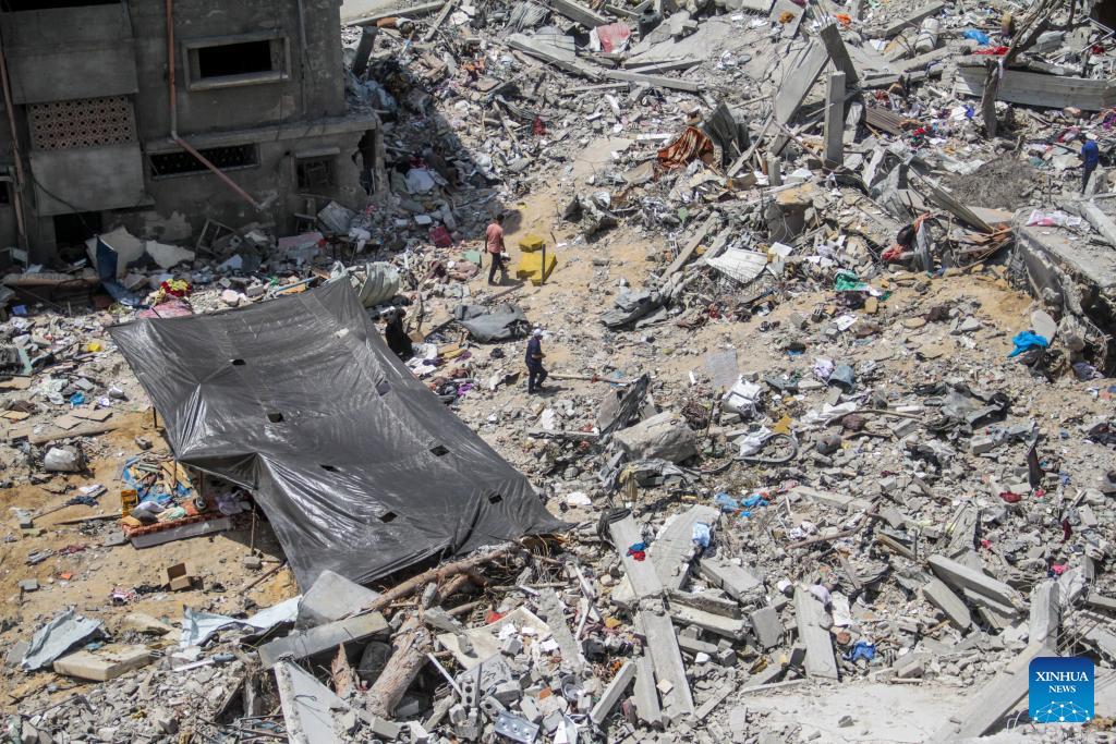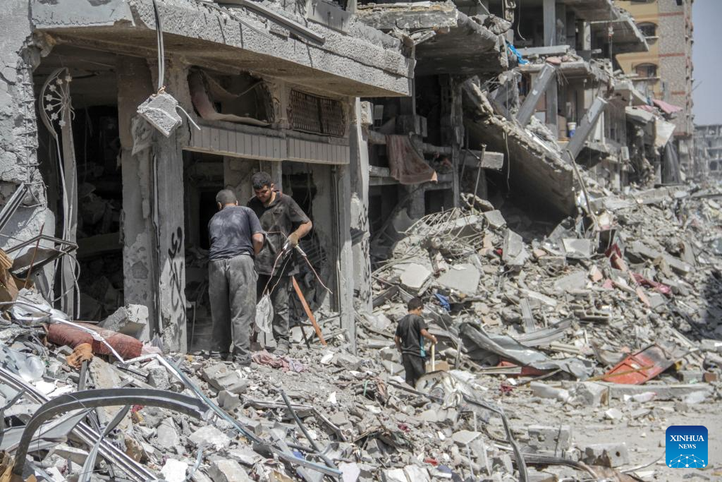 People collect items from the rubble at the Jabalia camp in the northern Gaza Strip, on June 3, 2024. Days after the Israeli army withdrew from Jabalia camp in the northern Gaza Strip after nearly three weeks of military operation, Mohammed Omran, who returned to the camp, is still in shock due to the scale and intensity of destruction in his neighborhood. During the offensive, at least 50,000 housing units were destroyed. Meanwhile, most of the sewage networks and roads in northern Gaza were completely damaged, according to Naji Sarhan, head of the municipal emergency committee in northern Gaza. (Photo by Mahmoud Zaki/Xinhua)