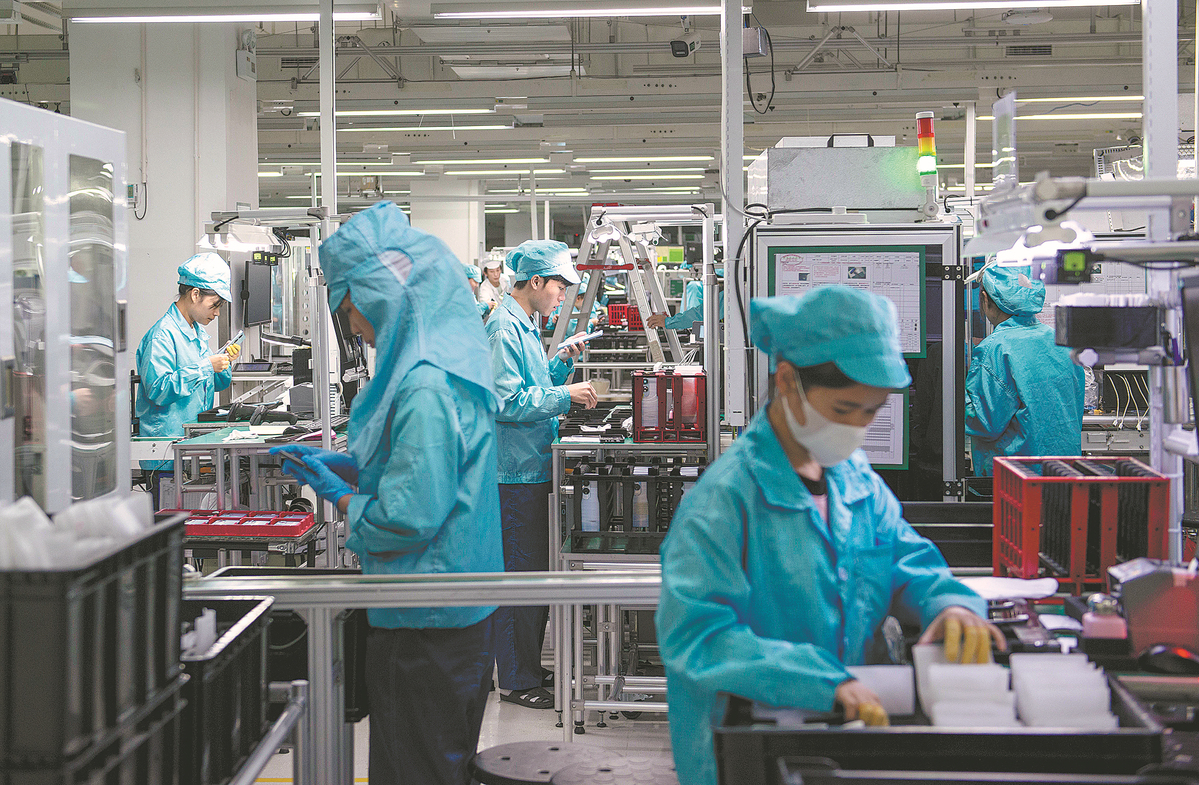 Staff work at a factory of domestic cellphone maker Oppo in Dongguan, Guangdong province, on May 18. XU JIAYI/XINHUA