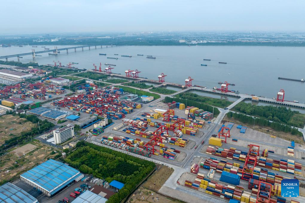 An aerial drone photo taken on May 26, 2024 shows an international container terminal of Zhujiaqiao area at Wuhu Port in Wuhu City, east China's Anhui Province. Wuhu Port in east China's Anhui Province has witnessed rising cargo throughput so far this year, with a large number of containers and vehicles waiting for shipment. Cargo handling facilities and cargo ships are working around the clock here to send products made in China on their way to the global market. (Photo by Xiao Benxiang/Xinhua)