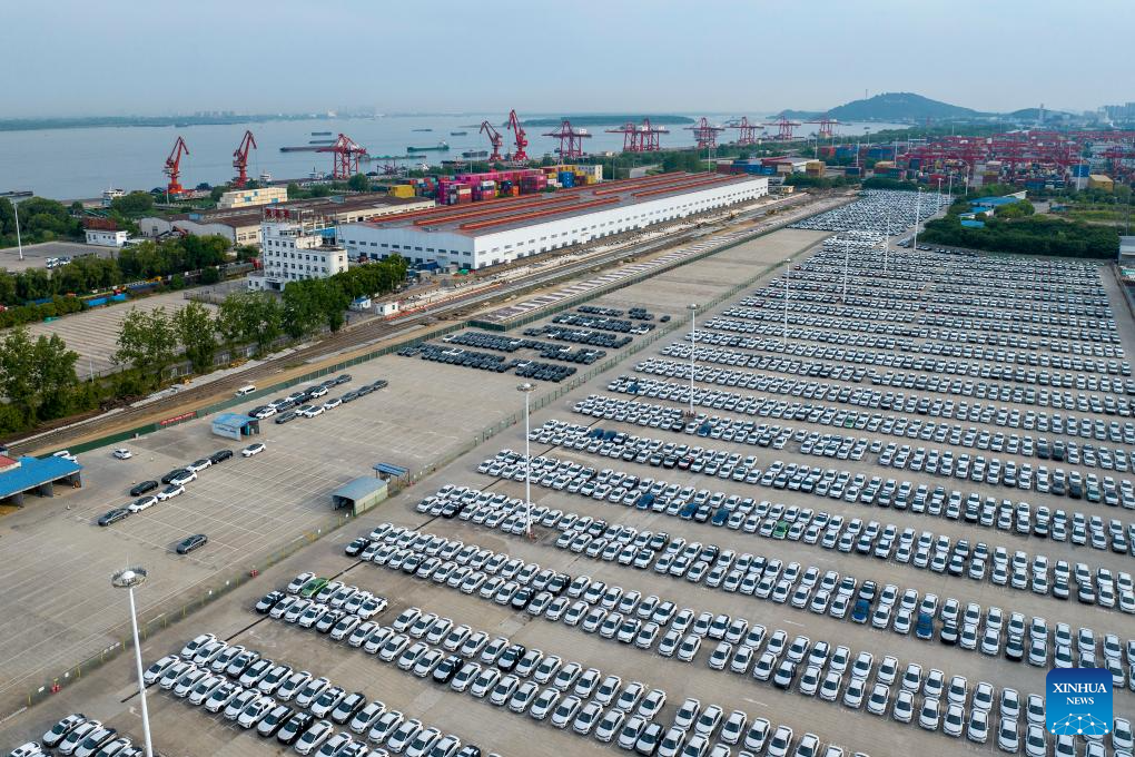 An aerial drone photo taken on May 26, 2024 shows vehicles for export at an international container terminal of Zhujiaqiao area at Wuhu Port in Wuhu City, east China's Anhui Province. Wuhu Port in east China's Anhui Province has witnessed rising cargo throughput so far this year, with a large number of containers and vehicles waiting for shipment. Cargo handling facilities and cargo ships are working around the clock here to send products made in China on their way to the global market. (Photo by Xiao Benxiang/Xinhua)