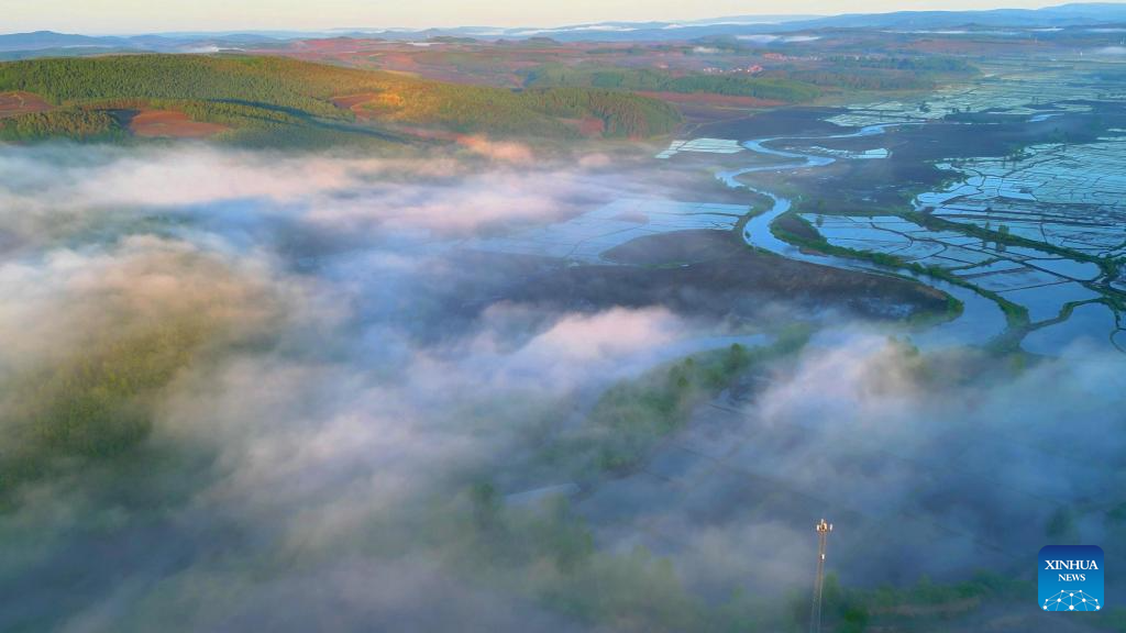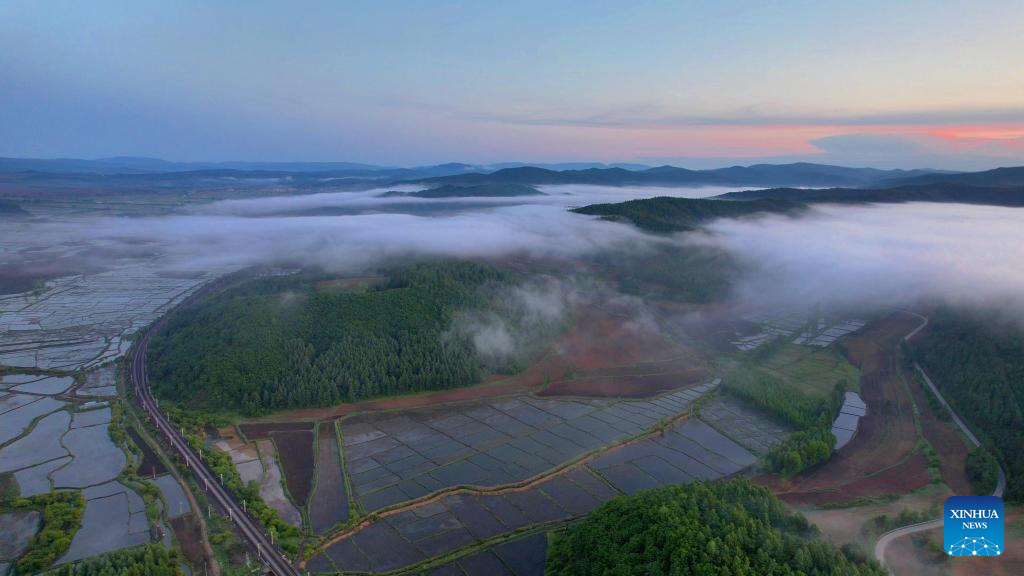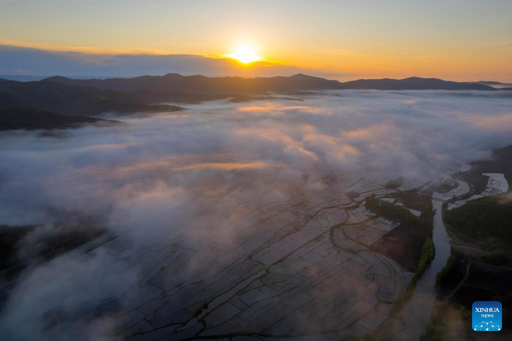 An aerial drone photo taken on June 3, 2024 shows fog over paddy fields in Hailin City, northeast China's Heilongjiang Province. (Photo by Wang Baoxun/Xinhua)