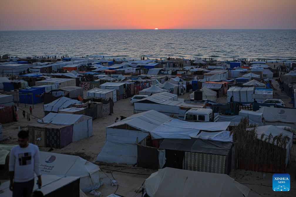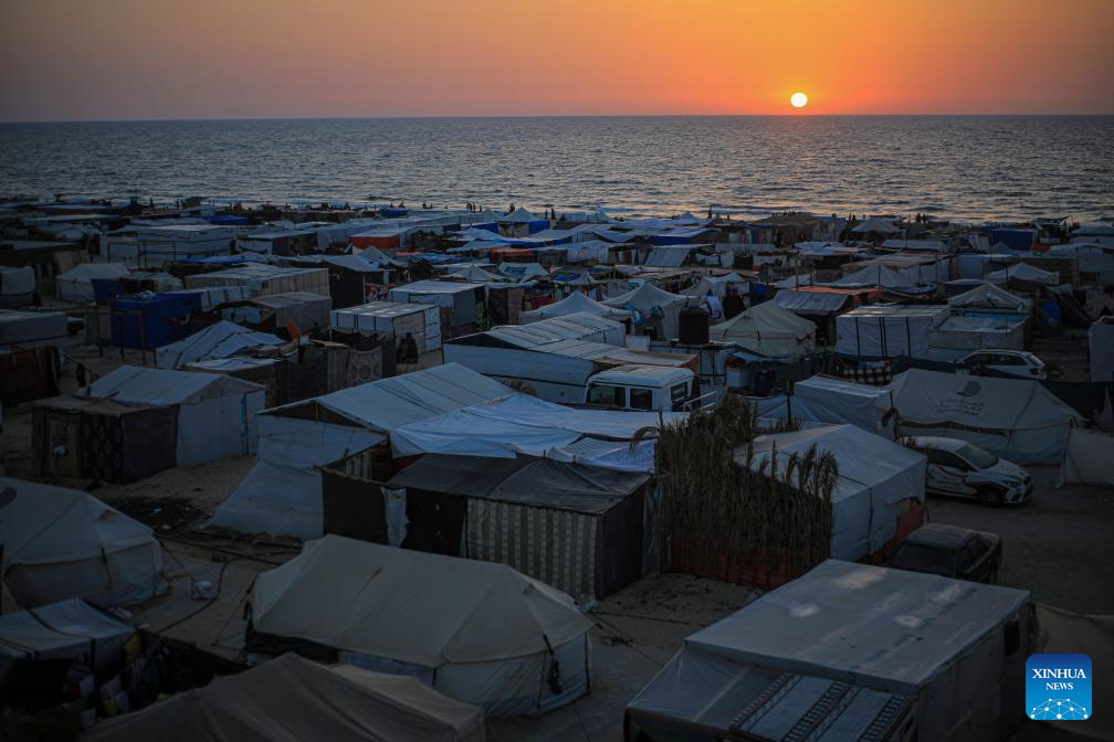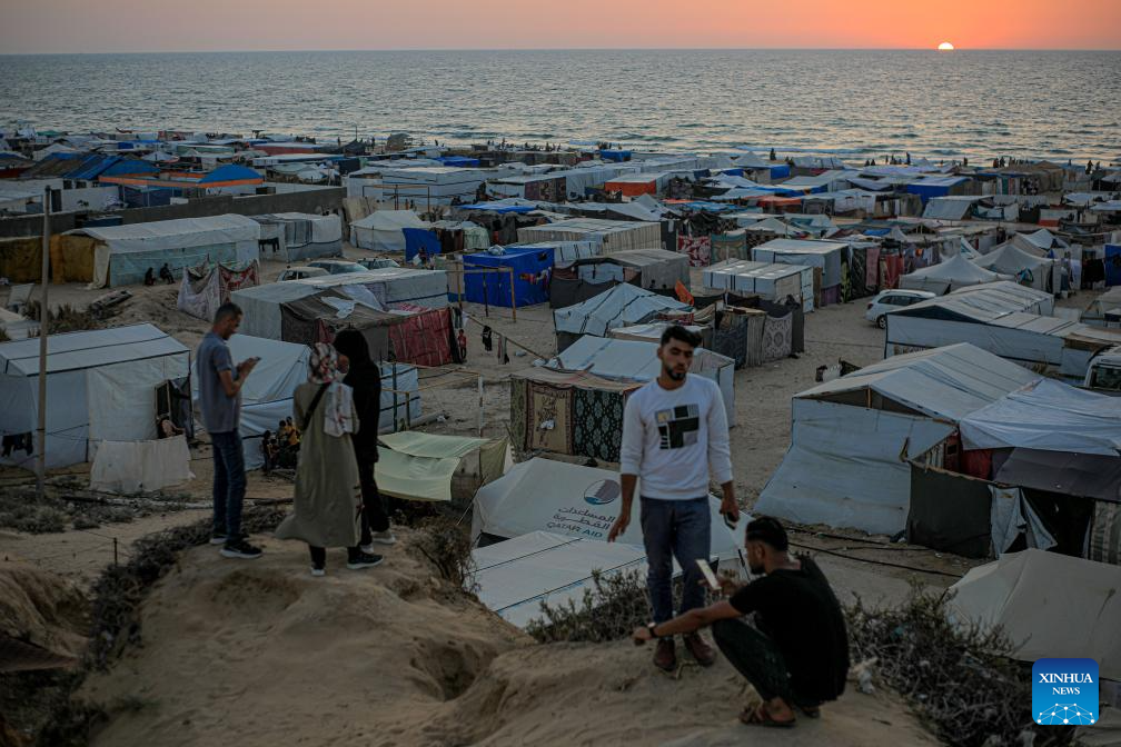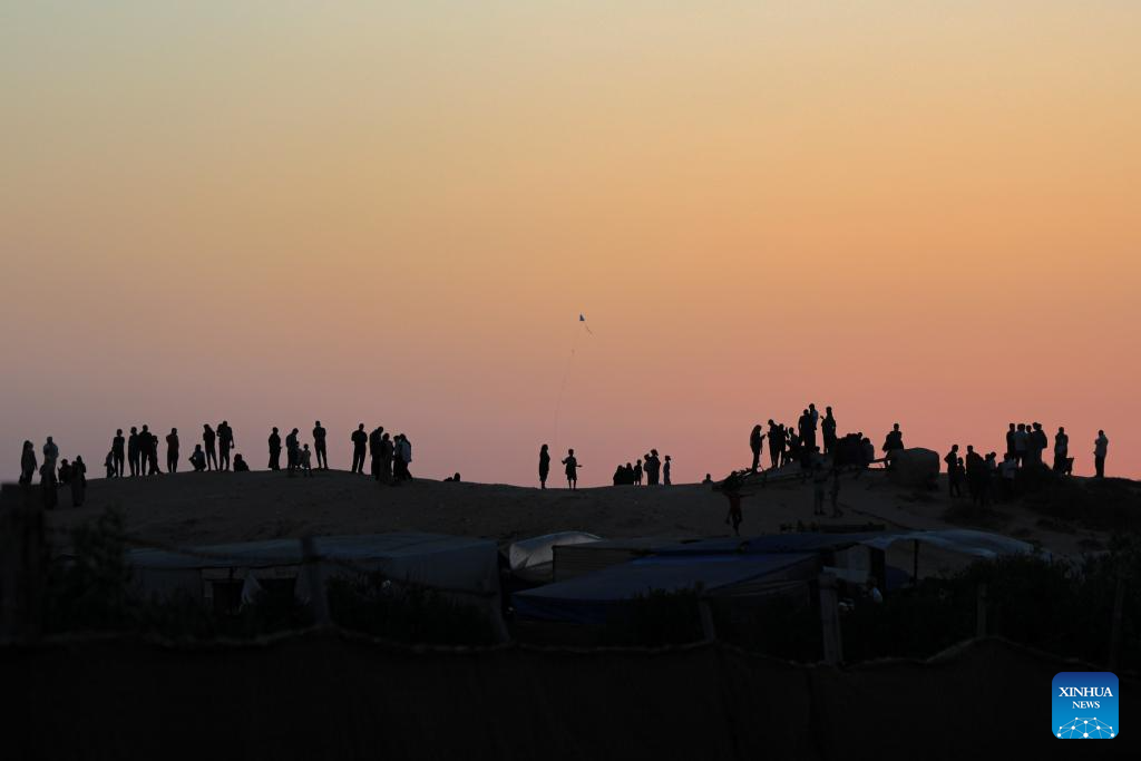 People are silhouetted against sunset above temporary tents for displaced Palestinians in the Mawasi area in the southern Gaza Strip city of Khan Younis, on June 4, 2024. On May 7, the Israeli army expanded its military operation in Rafah, ordering more than 1.5 million Palestinians sheltering there to head to Khan Younis and other central areas of Gaza. (Photo by Rizek Abdeljawad/Xinhua)