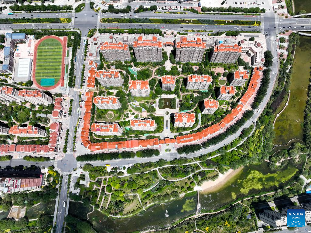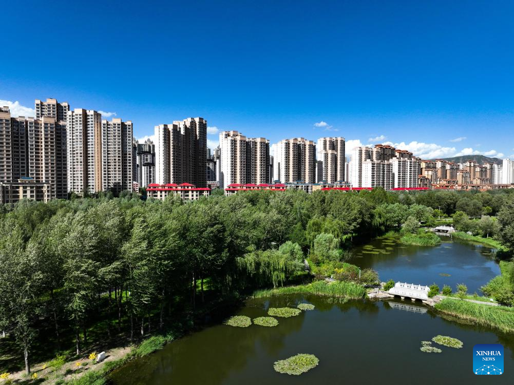 An aerial drone photo taken on June 4, 2024 shows a wetland park in Xining, capital of northwest China's Qinghai Province. Urban ecosystem in Xining has greatly improved thanks to landscaping efforts in recent years, and the city is also more and more habitable. (Xinhua/Zhang Long)