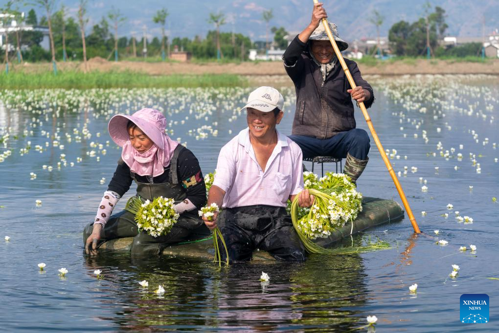 Newly harvested ottelia acuminata flowers are pictured at an ottelia acuminata planting base in Eryuan County of Dali Bai Autonomous Prefecture, southwest China's Yunnan Province on June 5, 2024. Ottelia acuminata only lives in fresh water of high quality, and is viewed as an indicator species of the natural environment. Its flowers are taken as an important food ingredient for people of the Bai ethnic group in southwest China. (Photo by Luo Xincai/Xinhua)
